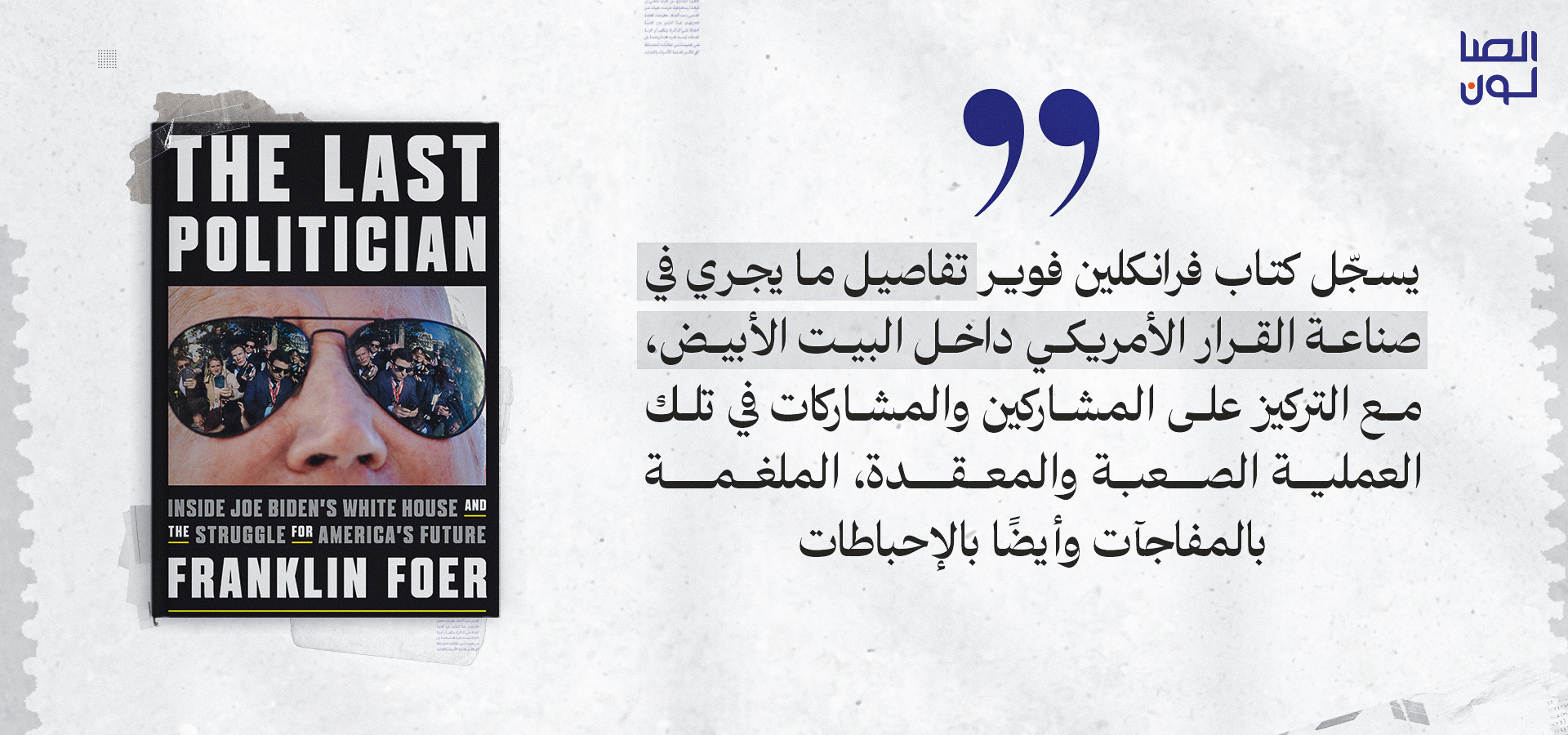 صدر هذا الكتاب قبل أسابيع قليلة من حدوث عملية "طوفان الأقصى" بتبعاتها على إسرائيل والفلسطينيين، وشعوب ودول المنطقة، وعلى واشنطن وإدارة بايدن ذاتها. يحمل الكتاب عنوان "السياسي الأخير"، ويتناول كيفية تعامل الرئيس الأمريكي الحالي، جو بايدن، وإدارته مع شؤون أمريكا والعالم منذ تسلمه مقاليد الحكم في واشنطن في كانون الثاني/ يناير 2021.
