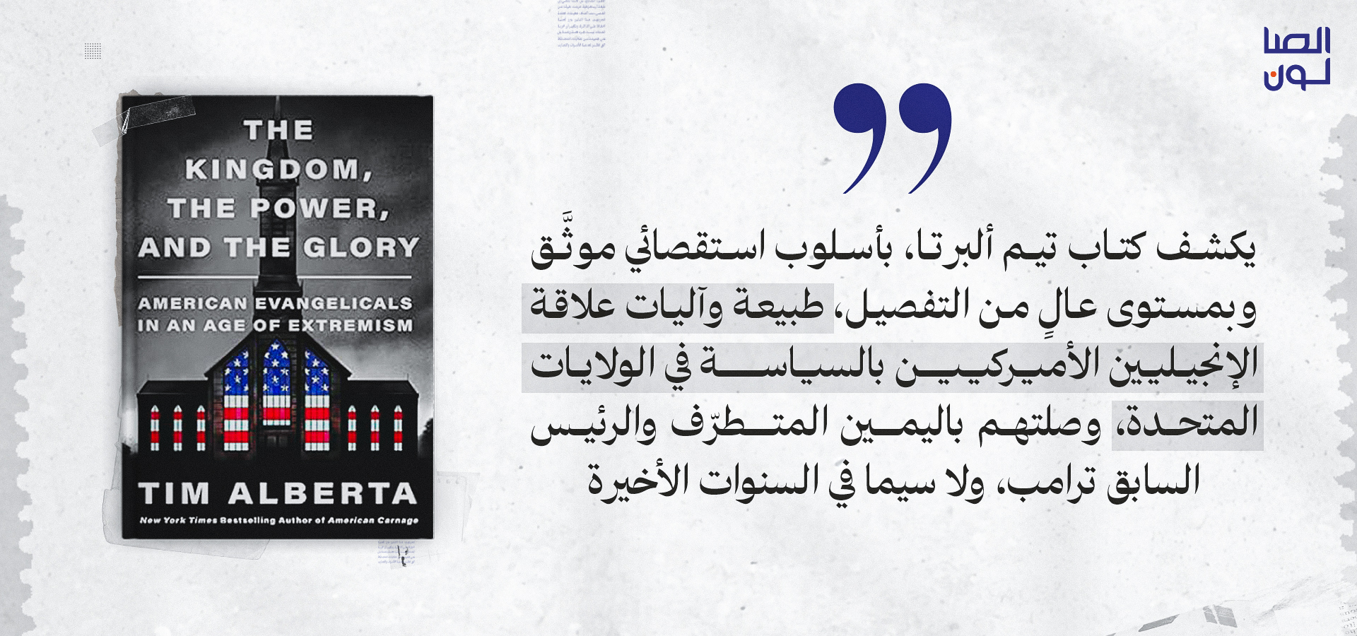 يكشف كتاب تيم ألبرتا، الكاتب والصحفي في مجلة "أتلانتيك" وابن قس إنجيلي، بأسلوب استقصائي موثَّق وبمستوى عالٍ من التفصيل، طبيعة وآليات علاقة الإنجيليين الأميركيين بالسياسة في الولايات المتحدة، وصلتهم باليمين المتطرّف والرئيس السابق ترامب، ولا سيما في السنوات الأخيرة. ويقدّم المؤلف تحليلًا تاريخيًا وأيديولوجيًا وسياسيًا لهذه الجماعة المؤثرة في اختيارات واشنطن. ويرى ألبرتا أن ترامب، على الرغم من كونه موضع جدل وانتقاد بسبب سلوكه الشخصي، يُمثّل بالنسبة لهذه الجماعة صاحب القرار الحاسم الذي يمكن الوثوق به والاعتماد عليه لتمرير ما يسعون إلى تحقيقه في المشهد الأميركي. وهذا الجانب تحديدًا، أي لماذا ينحاز الأميركيون إلى ترامب، يظل بحاجة إلى فهم أعمق وتفسير أشمل لدى كل من يتعامل مع الولايات المتحدة وسياساتها الداخلية وعلاقاتها الدولية.